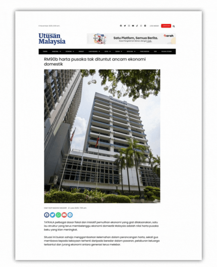 Seperti keratan akhbar dari utusan Malaysia bertarikh 18 November 2025 bertajuk, RM90 bilion harta pusaka tidak dituntut. Ia merupakan masalah besar terhadap keluarga & ekonomi negara. Statistik ini menunjukkan berbilion aset masih “beku” kerana prosedur tuntutan yang rumit mungkin disebabkan waris tidak mempunyai ilmu atau kepakaran, cabaran kehilangan dokumen yang diperlukan untuk proses tuntutan, atau terdapatnya pertelingkahan diantara ahli waris. Jika harta pusaka tidak diselesaikan, ahli waris boleh kehilangan akses kepada rumah, wang simpanan dan modal yang sepatutnya membantu kehidupan dan perniagaan keluarga mereka. Setuju?